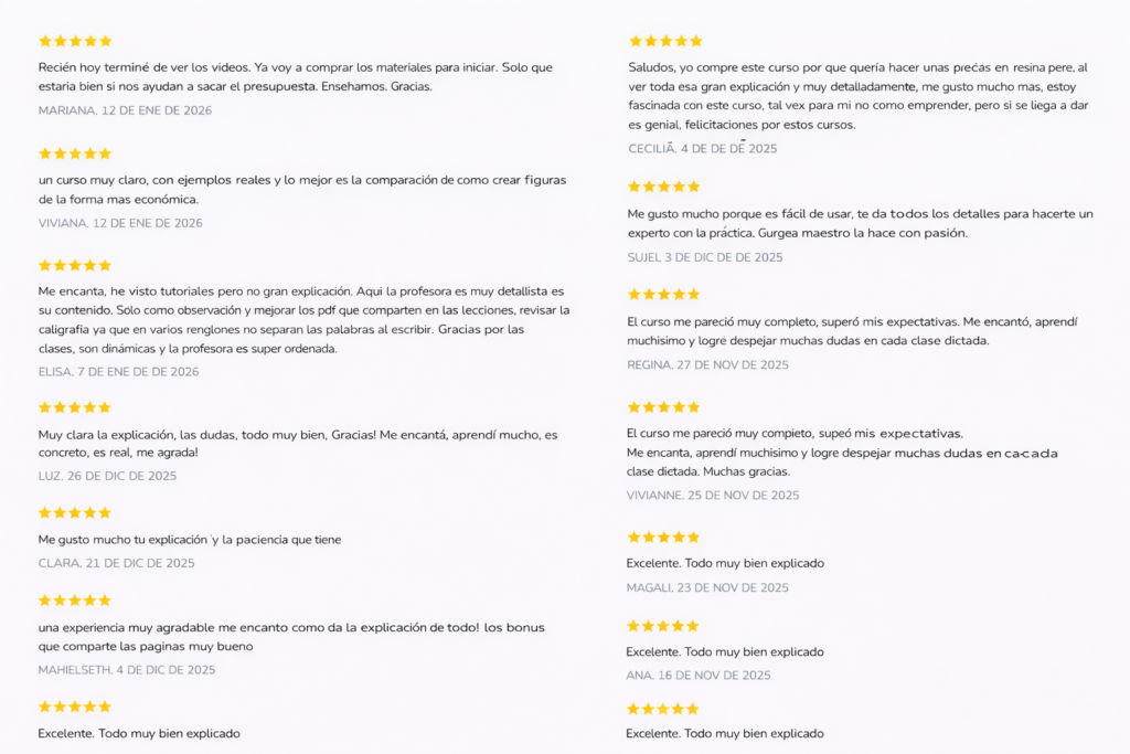 Las opiniones de las alumnas sobre el curso Accesorios en Resina para Emprender son altamente positivas ⭐⭐⭐⭐⭐. Muchas destacan lo claro del contenido, la explicación paso a paso y lo accesible que resulta incluso para quienes comienzan desde cero. También se repite mucho la valoración del acompañamiento, los bonos incluidos y la posibilidad de avanzar a su propio ritmo. En conjunto, las reseñas reflejan una experiencia satisfactoria, con resultados reales para quienes aplican lo aprendido y se comprometen con su proceso creativo y emprendedor 💖✨