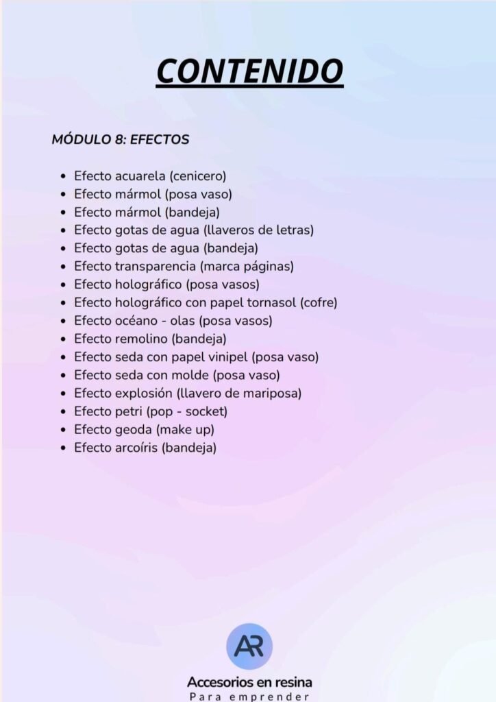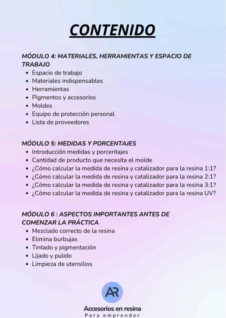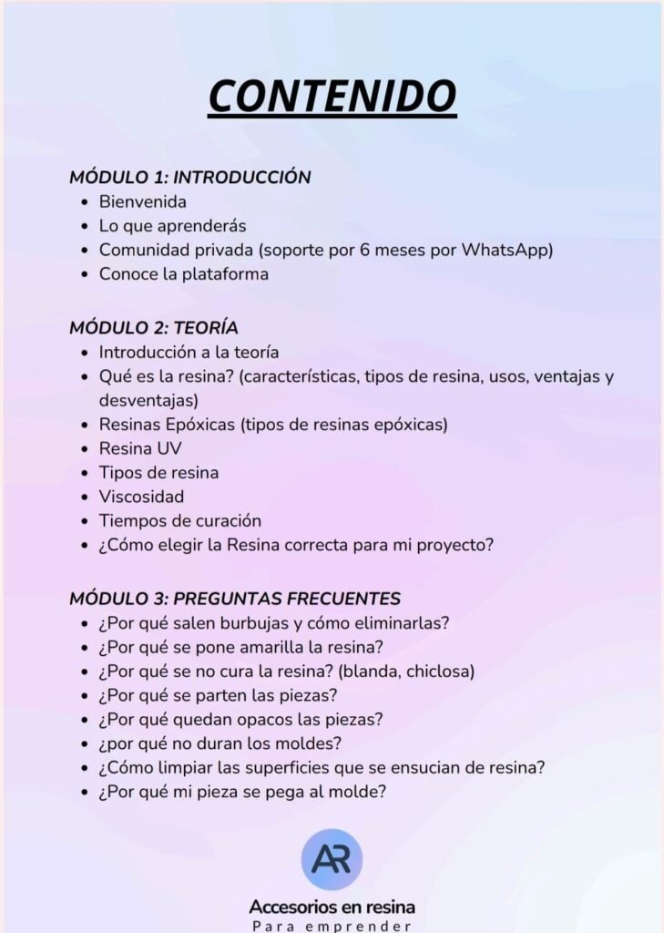 No es un curso improvisado ni solo teórico. El contenido está organizado paso a paso, con clases en video donde se explica desde lo más básico hasta técnicas más avanzadas, lo que lo hace accesible incluso para quienes nunca trabajaron con resina 🎨✨