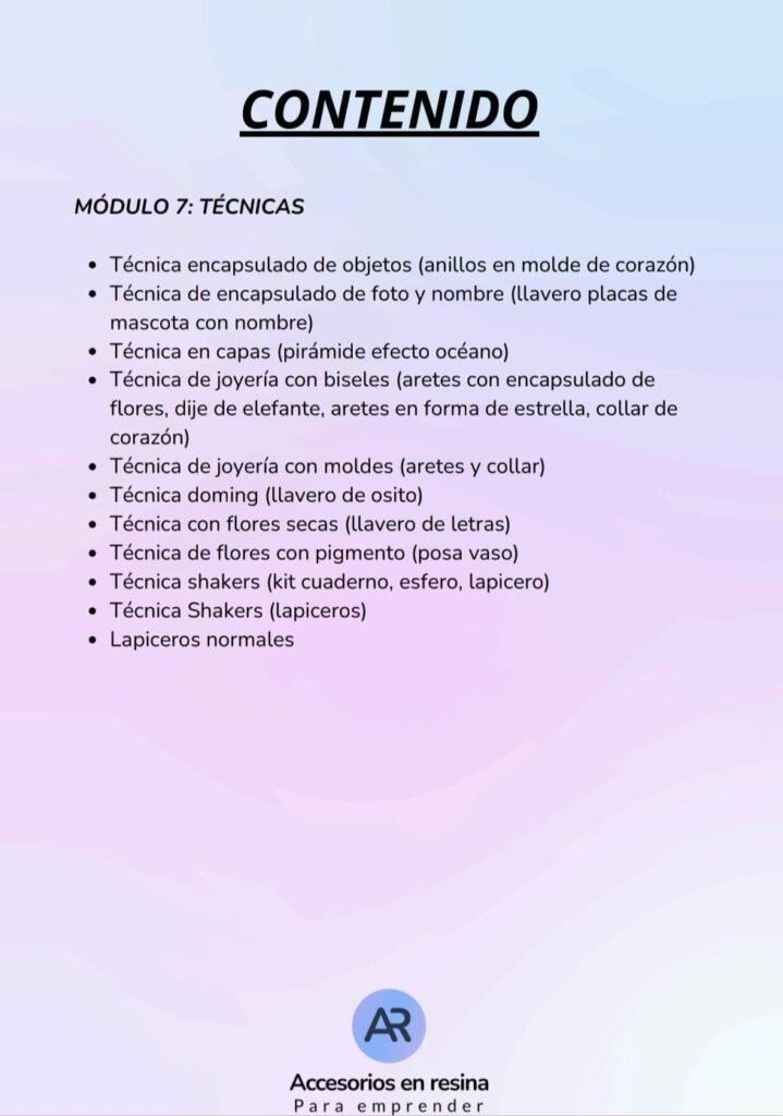 A lo largo de más de 85 clases en video, el programa enseña paso a paso las técnicas para crear accesorios en resina, elegir materiales accesibles y desarrollar productos en tendencia. Además, incluye orientación para vender en redes sociales, crear una marca y comenzar a generar ingresos de forma independiente 📱✨