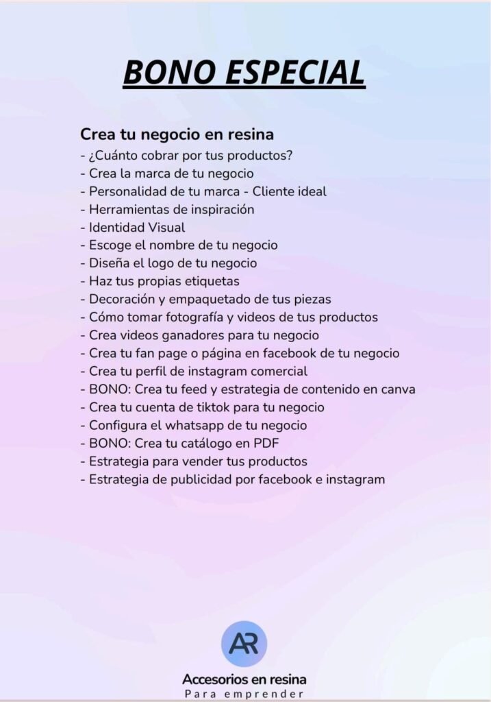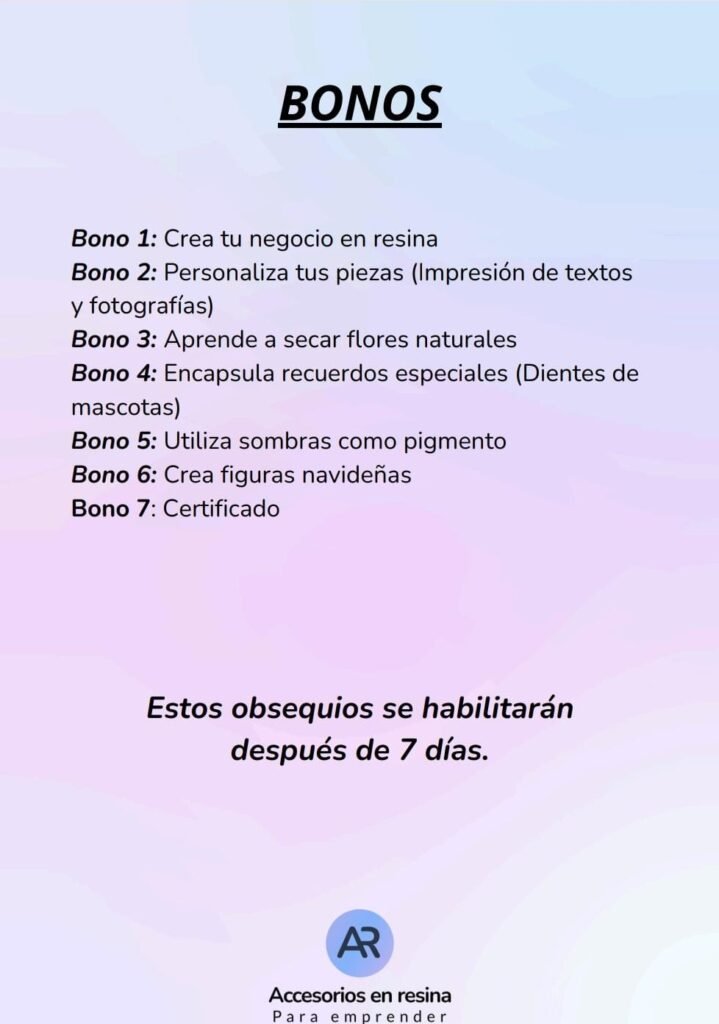 Además del contenido principal, al inscribirte en el curso accedés a bonos especiales pensados para ayudarte a diferenciarte, sumar valor a tus creaciones y potenciar tu emprendimiento en resina 💖✨